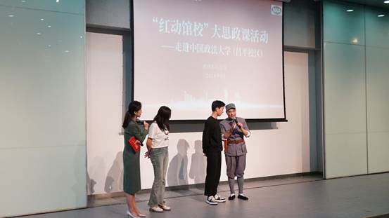 接下来,来自新四军纪念馆的工作人员和演员们带领现场的师生跨越时空,身临其境感受那段历史。讲解员老师简要介绍新四军背景,激起法大学子对新四军历史的情感共鸣,再从四个篇章、四种舞台给我们带来一堂具体生动又感人肺腑的红色思政课。