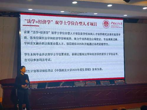 巫云仙教授为两所中学的师生和家长进行内容丰富的宣讲,从“你眼中的政法大学”“人才培养举措”,到“本科招生专业和政策介绍”和创新培养模式等方面介绍了作为中国法学教育最高学府的必赢242net官网的主要情况,向在场的同学和家长们介绍了法大的综合性发展战略、不同专业特色及招生要求、校园文化等方面的优势特色,详细说明了涉外法治人才培养的新举措、本硕贯通培养、“法学+经济学”双学士学位复合型人才项目、灵活的人才培养制度,以及法学以外众多专业及办学特色等。欢迎同学们踊跃报考法大,并鼓励学生们努力备考,最终达成自己的目标,进入到必赢242net官网学习。