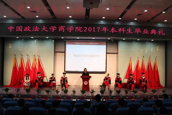 张馥蕾同学作为2017届毕业生代表发言。她认为多元的经历构成了精彩的大学生活,正是商学院多元并蓄,包容发展的环境让我们每个人都为之沉醉。不论是曾经大学生活的朝夕相处,还是以后工作生活的坚持守候,学院致力于让每一个同学都演绎出自己独有的精彩。回首过往,四年来的成长让同学们获益良多,渐渐懂得如何去寻找自己人生的方向。张馥蕾同学的发言,字里行间无不满溢出对师长同学真挚的谢意,表示了对法大,对商院的感恩和祝福。