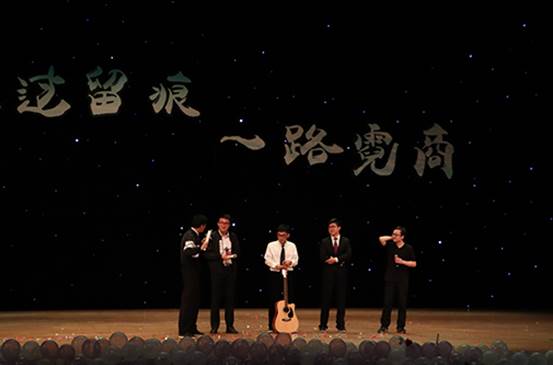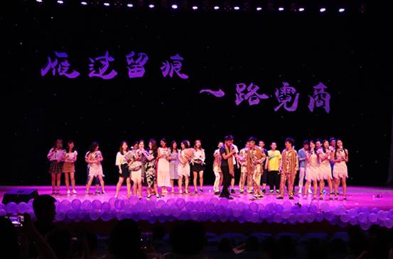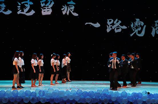 接下来是成思危现代金融菁英班的节目——《“成”就青春》。一把吉他,两把琵琶,油纸伞下的舞者如精灵般绽放着优美的舞姿。随后曲风转换,一段新疆舞蹈纵情展现着异域风情,大红的裙摆飞扬着火一般的热情。之后的歌曲串烧中,《平凡之路》的歌喉低处沉稳,高潮动人;《以人民的名义》的嗓音低沉有力,饱含深情;《一路顺风》的歌声满怀祝福,温情无限。最后,伴随屏幕滚动的班级照片,成班学子带来集体朗诵,怀念这四年用青春的丝线,用幸福的璎珞编织成的日子,赢得满堂喝彩。