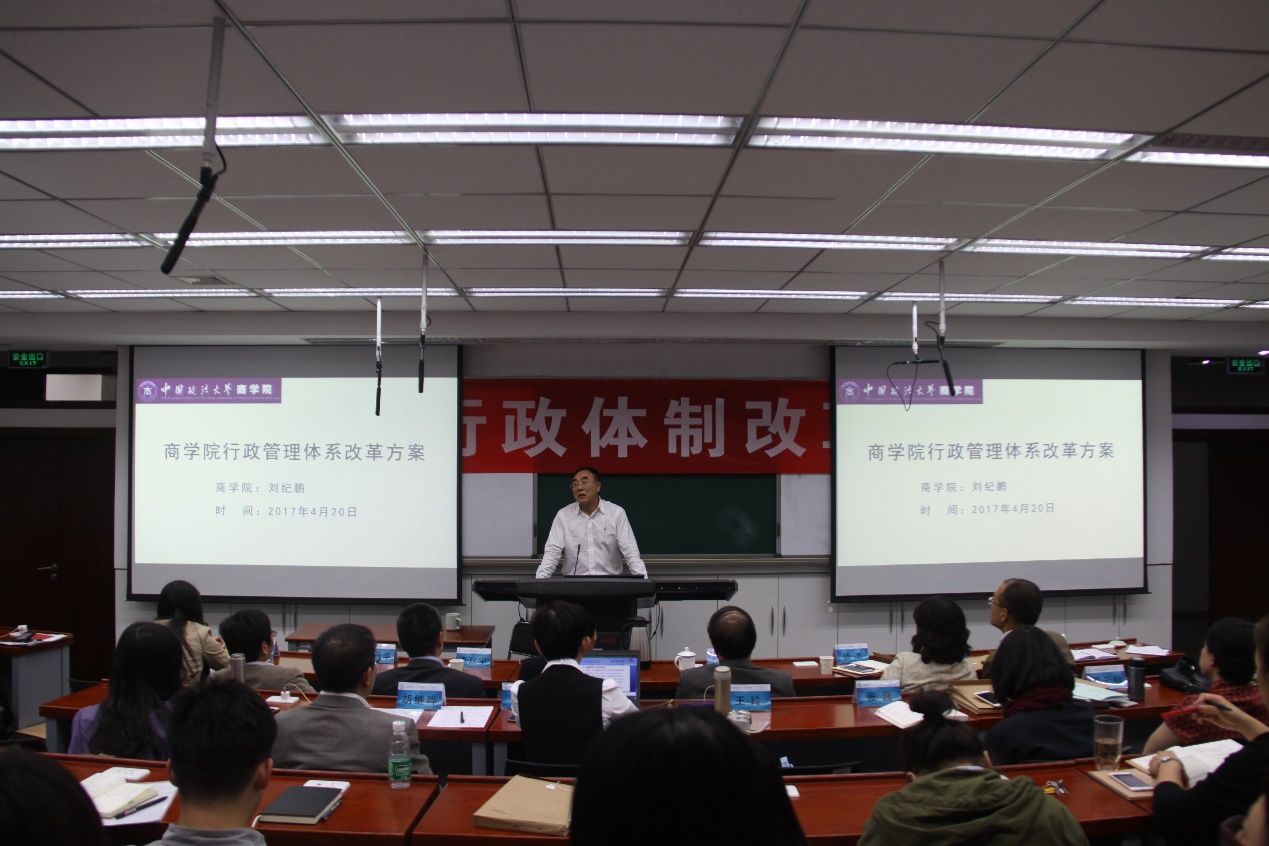 4月20日,商学院召开了行政管理体系改革大会,全院80余名教职员工参加了会议,刘纪鹏院长做重要报告,我校研究生院李曙光院长出席。