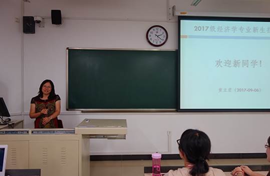 经济学专业的专业导向课程由经济系主任张巍教授、副主任黄立君副教授和邓达副教授主讲,课程在明法楼104教室举行。张巍老师介绍了“一主两翼”的改革及其创新、双导师制及商学院理事会,简要说明了经济学学科概况与学习特点。黄立君老师则深入浅出地介绍了经济学本科生培养方案、课堂教学与课堂实践教学,并以“为者常成,行者常至”与大家共勉。最后,邓达老师与同学们交流大学四年应如何度过,希望大家在大学中学会利用资源,丰富大学生活。