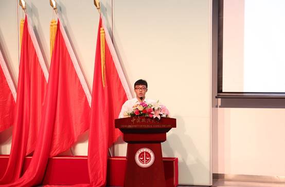 商学院2015级学生付浩楠同学作为在校生代表发言。他回想起大学生活的点点滴滴,学校浓厚的学习氛围以及法大的同门之谊督促着大家不断进步,老师的认真负责与默默付出感染着每一个人。他衷心祝愿新生们在商院坚定梦想,再创辉煌。