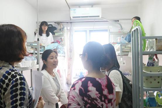 (图:商学院分党委副书记、副院长何欣,2016级辅导员王文培于宿舍看望新生)
