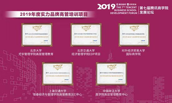 同时获得实力品牌高管培训项目奖项的院校有北京大学光华管理学院高层管理教育、上海交通大学安泰经济与管理学院高管教育(EE)中心、对外经贸大学国际商学院、北京交通大学经济管理学院EDP项目。