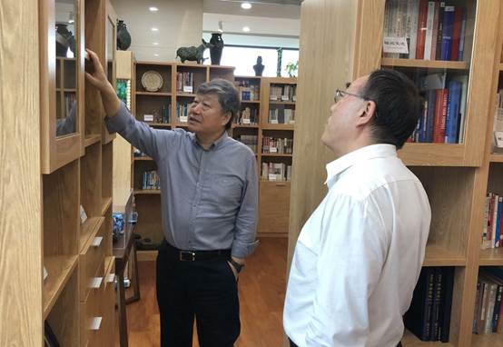 会谈结束后,刘纪鹏院长向张瑞敏主席赠送了《资本金融学》和《法商管理学》,他说到,这两本书是商学院目前法商和融商特色发展的基础,并介绍了法商管理“工商伦理、企业管理、法人治理、公司法治” 的四个内涵。张瑞敏主席还带刘院长参观了自己的书房,并指着一副写着“玉树深藏知其有意,群山高耸尽是无名”的书法作品说到,这就是自己理解的企业家文化。