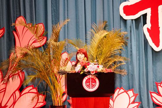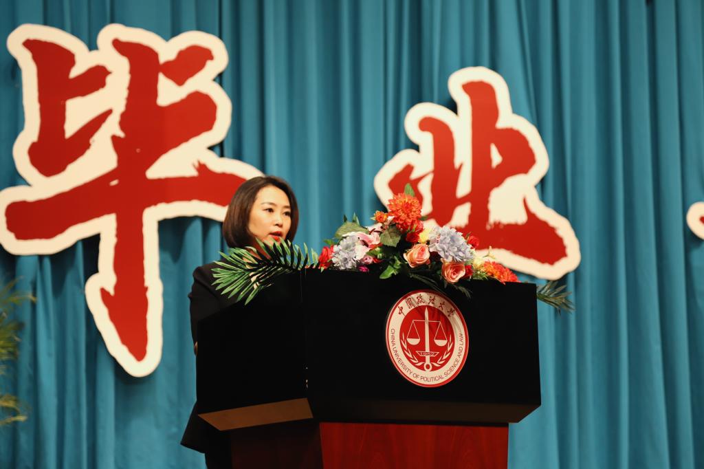 随后教师代表郭颖教授向全体毕业生致辞。郭颖老师表示,成长是每个人一生的话题,对学生、对老师来讲,我们都是彼此成长的见证人。郭颖老师代表全院教师对商学院近几年来的成长表示了祝贺,并为学生们的成长感到骄傲,郭颖老师真诚祝愿每一位法大学子可以在成长中收获一颗豁达之心、进取之心和责任之心。
