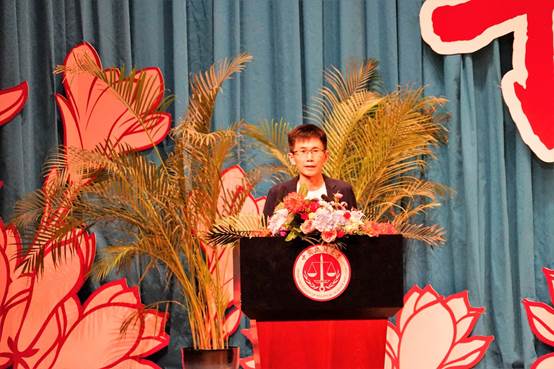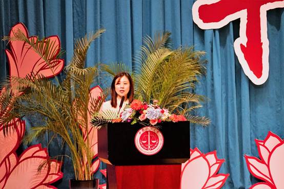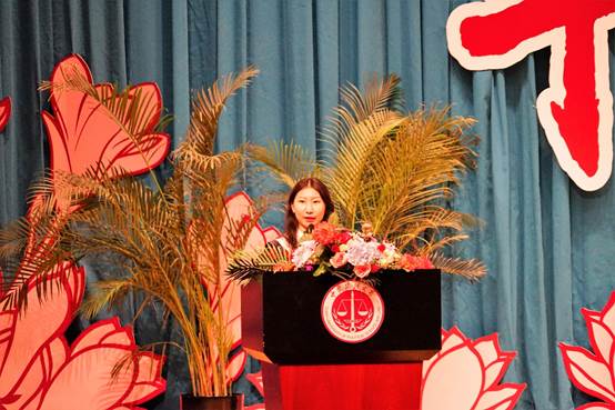 工商管理1702班的高赟同学作为毕业生代表发言,她首先回忆了四年充实又美好的大学生活,“四年四度军都春”,法大学子们从懵懂青涩的少年,不断学习、不断经历、不断成长,一路走来,披着朝霞的灿烂、伴着星月的荣光,如今离别在6月,带着对大学生活的浓浓不舍,带着四年的收获和成长,以及对未来炙热的期待,走向更加美好的未来。高赟同学向每一位学子送上祝福,希望大家在未来的追梦路上,“前进而勿顾后,背黑暗而向光明。永远都骄傲而坦荡的生活”。