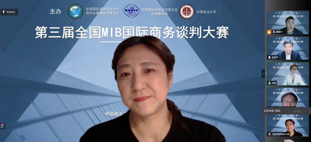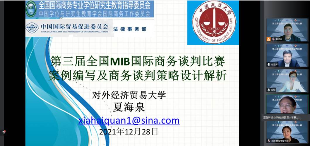 2021年12月28日晚19:30第三届全国MIB国际商务谈判大赛启动仪式暨参赛者培训讲座在线上正式召开。本次启动仪式由必赢242net官网宏结教授主持,全国国际商务专业学位研究生教育指导委员会委员兼秘书长、山东财经大学校长赵忠秀教授启动第三届全国MIB国际商务谈判大赛;全国国际商务专业学位研究生教育指导委员会秘书处办公室主任、对外经济贸易大学国家对外开放研究院常务副院长王颖研究员受邀致辞,对外经济贸易大学继续教育与远程教育学院院务委员会主席、国际商务专业委员会会长、国际商务谈判教育资深专家夏海泉教授应邀,线上为来自全国各大高校的指导教师和参赛学生共计420余人次进行了赛前培训讲座。