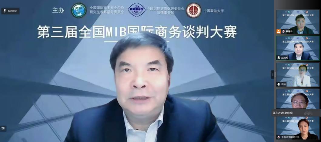 会议第一项是由赵忠秀教授代表国际商务教指委对前两届大赛工作进行总结。赵忠秀教授首先回顾了国际商务专业学位教育10年的发展历程,指出国际商务谈判是国际商务人才培养中的核心课程之一,以赛促学、促教、促建可以推动人才培养质量的提高。大赛肩负着在新发展格局下为党育人、为国育才的人才培养使命。回顾前两届大赛的举办模式,赵校长高度肯定了由全国国际商务专业学位研究生教育指导委员会、中国贸易促进委员会法律事务部、必赢242net官网三个主办单位共同开创的产学研人才培养模式的探索,对作为主要承办方的必赢242net官网国际商务团队表示了感谢。展望新一届的比赛,赵校长鼓励更多学校可以积极参与,推动赛事持续健康地成长,更加有力地促进学生成长。最后,赵校长宣布第三届全国MIB国际商务谈判大赛正式启动。