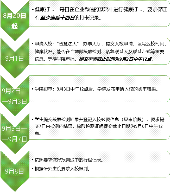 1.低风险地区新生,持健康通行码“绿码”和7日内核酸检测阴性证明来校报到;
