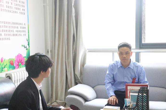 上午11时,采访活动在逸夫楼4048正式开始。当问到返回母校的心情时,孙国锋师兄饱含深情的回答:“非常激动,也非常亲切,就像远方的游子回到自己的家里一样感到温馨。”谈及本科阶段的学习对自己职业的影响,孙国锋师兄说:“我认为本科阶段的学习对我影响最大的地方在于,它向我灌输了法治思维和以人为本的思想,使我逐渐树立了法治观念和为群众服务的意识,我们学校良好的思想政治教育使我坚定信念,能够数十年如一日地坚守在公安工作岗位上。”此外,孙师兄还分享了自己日常工作中印象比较深刻的事情:“有一天傍晚,我们派出所接到报警称:一名五岁的小男孩走丢了。我和其他民警在景区内不停地到处寻找,一直到晚上11点左右才找到这名小男孩,小男孩当时不停地哭泣,当我们把这名小男孩交给其父母、孩子和其父母重逢时,其父母对我们民警帮助其找到孩子十分感激,这时我觉得不管我们的工作多么辛苦,能够为广大游客排忧解难,我们的付出也是值得的。”问到孙国锋师兄是否想念家乡时,他说出了自己的心里话:“当然想念家乡啊,那里是我生长的地方,但是泰山的安全需要我和同事们去维护,遇到危难的游客需要我和同事们去帮助,舍小家,为大家。”