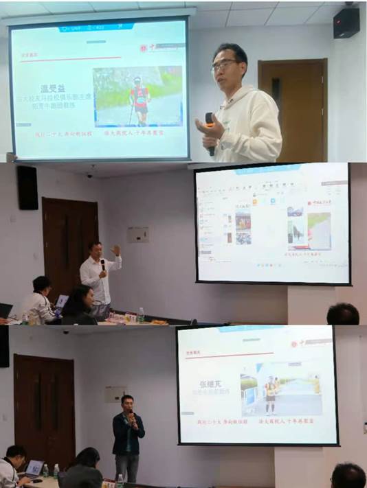 沙1参赛队队委吴仲凤分享了首届亚沙赛的拼搏历程,表示自己最大的感受就是团队对于成功很重要;沙2参赛队校友王劲英分享了自己参加沙2、沙8、沙10以及丝路赛的经历,以及自己和父亲的交流往事。她表示跑步对身边的人是个很好的赋能激励,并鼓励大家“如果你向往一个地方,无论什么年龄,一定要去”;沙3参赛队校友孔玲通过视频分享了沙3的点点滴滴,她说“坚持像沙漠里的植物一样顽强生长,心灵像沙漠里的天空一样湛蓝清澈”,鼓励大家一起走出去、一起看更大的世界,让在座的学弟学妹们对沙漠无比神往;首届国际商学院丝绸之路(张掖)挑战赛代表万晓燕分享了比赛的照片和过程,表示跑步也是一种修行,一群人可以走得更远,并告诫学弟学妹们“外面有很多喧哗,很多诱惑,不要太在意胜负,找到自己的节奏往前走”;沙5参赛队校友杨靖宇说:“回想亚沙,特别幸福。”他分享了自己三天扛着旗帜,终于在第三天一路狂奔,在赛场上大放异彩的故事。他还特别强调赛前准备的重要性。“最好的护具就是平时练就的肌肉”,比赛前要多做准备、多做训练,把体能练上去;首届海上丝路(南澳)国际商学院丝域挑战赛代表周珮萱为大家讲述了仅此一届南澳岛特别的故事,认为跑步收获了欢乐、激情、荣誉、友谊、团队精神和默契同伴,更收获了诗和远方。