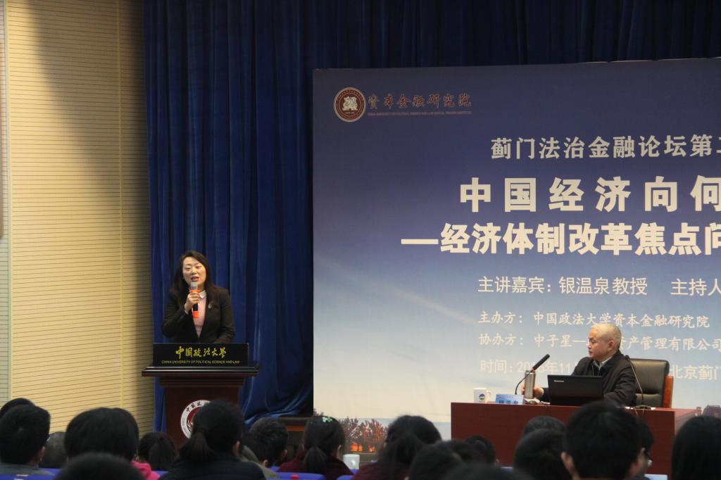 李树忠在致辞中说,蓟门法治金融论坛得名于燕京八景中的“蓟门烟树”,文化渊源厚重,是法大着力打造的品牌论坛。而本次论坛的主题具有重要的理论和实践意义,对于如何处理好供给侧改革背景下政府和市场的关系、宏观经济走势等重要问题,期待主讲嘉宾与在座专家有深入的阐释,带来一场学术盛宴。银温泉是法大的兼职教授,感谢长期来对政法大学的支持,并期待未来为法大师生带来更精彩的讲座。