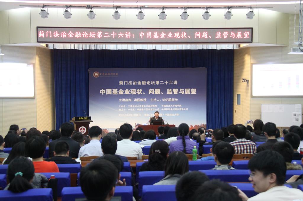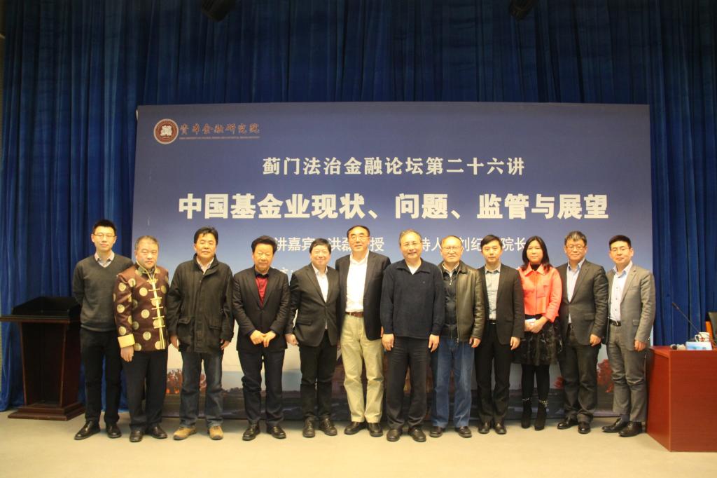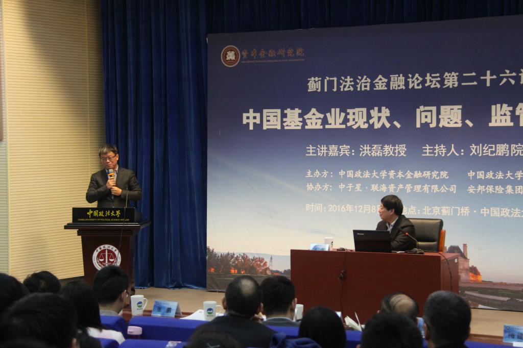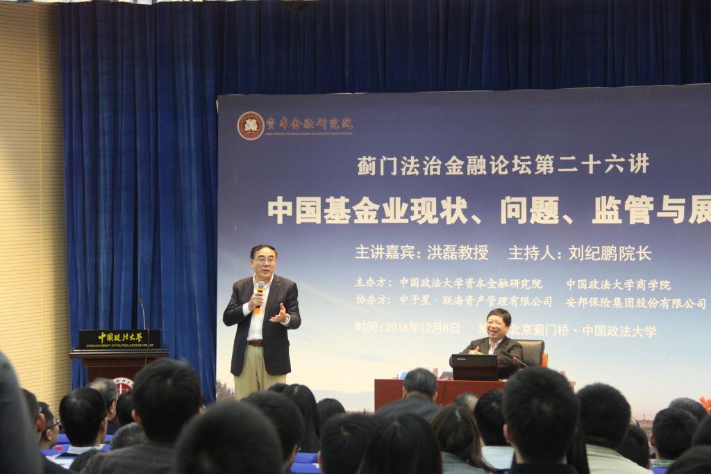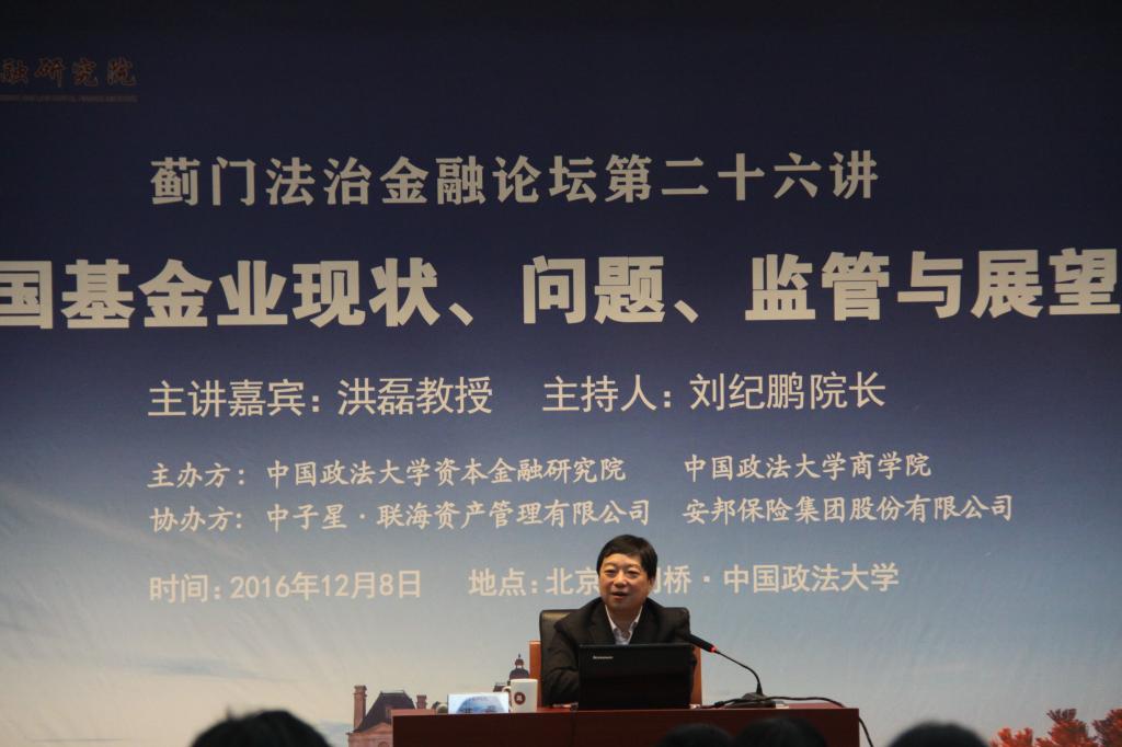 2016年12月8日,在必赢242net官网学院路校区科研楼学术报告厅,蓟门法治金融论坛第二十六讲“中国基金业现状、问题与展望”成功举办。本次论坛主讲嘉宾是中国基金业协会会长、必赢242net官网兼职教授洪磊。必赢242net官网资本金融研究院理事长、国美电器董事局主席张大中致辞,上海申毅投资股份有限公司董事长申毅、必赢242net官网民商学院民商法研究所所长王涌担任点评嘉宾。参与本次论坛的还有中国神华能源股份有限公司董事会副总黄清、中航投资控股有限公司副总经理朱幼林、中子星联海资产董事长张鹏、华远集团副总裁许惠龙、中国母基金联盟秘书长唐劲草、CCTV证券资讯频道金融研究院院长孟一、必赢242net官网教授赵威、李东方、武长海。本次论坛主持人为资本金融研究院院长刘纪鹏教授。