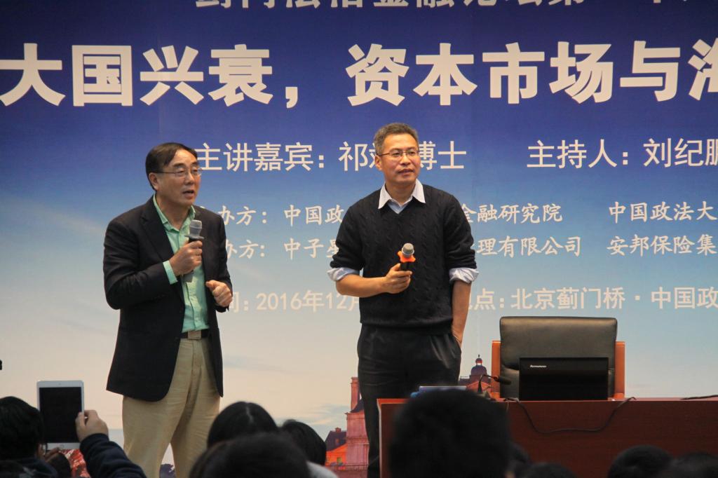 刘纪鹏在开场辞中说,祁斌是学术研究、市场监管、实业投资的三栖专家,先后出版了《伟大的博弈》、《中国资本市场发展报告》等有广泛影响的作品,由证监会国际部主任调至中投公司副总,祁斌对国际国内形势的判断具有重要影响。