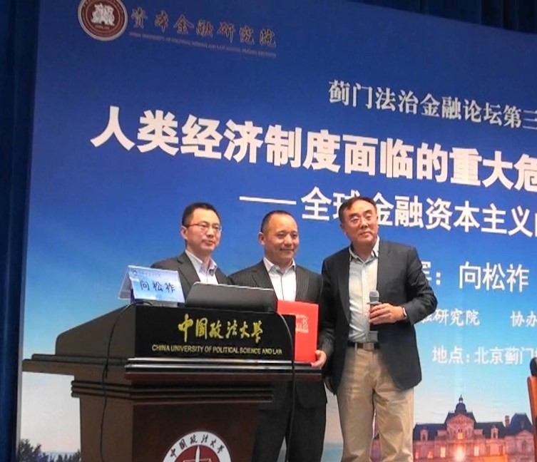 (李欣宇书记为向松祚颁发兼职教授聘书,图右起:刘纪鹏,向松祚,李欣宇)