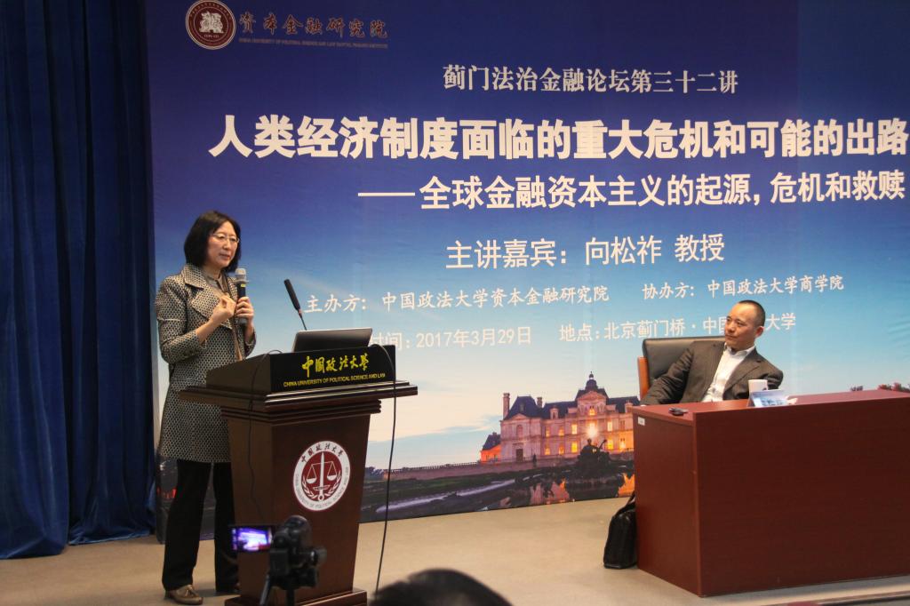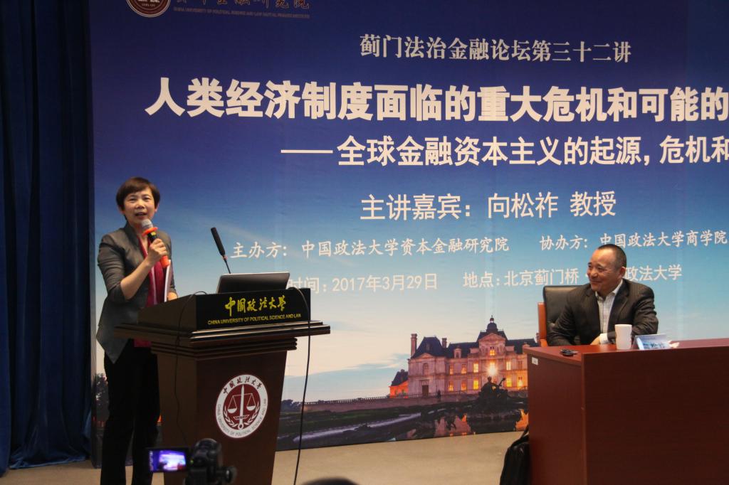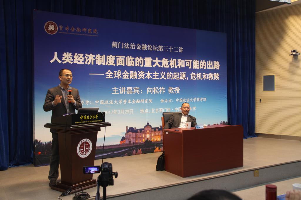 向松祚教授学识渊博,其著作《新资本论》在学界引起了巨大反响。整个演讲,面对全球金融资本主义这一非常前沿和深刻的话题,围绕起源梳理、危机分析和救赎方案,从现象到本质,从制度到理论,旁征博引,鞭辟入里,既有全球视野,又兼家国情怀,报告厅里不时传出热烈鼓掌声。对于法大师生来说,这是一次思想震撼教育,是对国际学术前沿的触摸,更是一次难得的思想盛宴。