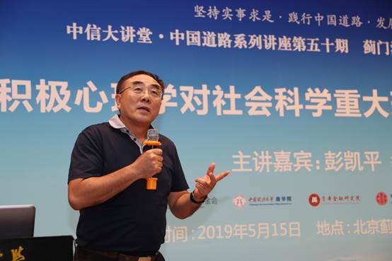 5月15日晚,中信大讲堂·中国道路系列讲座第50讲暨蓟门法治金融论坛第73讲在必赢242net官网学院路校区科研楼学术报告厅举行。本次论坛邀请清华大学社会科学学院院长、心理学系主任彭凯平教授作为主讲嘉宾。必赢242net官网校长黄进、修远基金会理事长、《文化纵横》杂志社社长、中信改革发展研究院资深研究员杨平教授,香港中文大学政治与公共行政系王绍光教授,及商学院各系所中心主任、全体辅导员、工商管理系全体教师、研究生和本科生200余人参加论坛。商学院院长、资本金融研究院院长刘纪鹏教授担任论坛主持。
