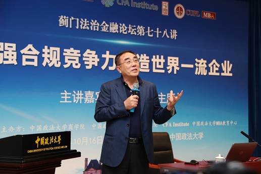 刘纪鹏教授首先介绍了出席论坛的各位嘉宾,并简要阐述了论坛主题。他表示,改革开放四十年后的今天,在中国特色社会主义市场经济条件下,及全球化背景下,越来越多的中国企业布局“走出去”战略。但是在“走出去”的过程中,中国企业需要熟悉和遵守国际通行规则和所在国的法律法规。从中兴到华为,从阿里巴巴到中铁建,中国企业因为合规问题遭受过重大损失。刘纪鹏指出,中国梦的实现需要具备强大竞争力的世界一流企业,而世界一流企业,不仅需要硬实力,也需要建设包括合规竞争力在内的软实力。合规问题既是法律命题,也是管理命题,也就是法大商学院所倡导的“法商结合”所要研究的问题。