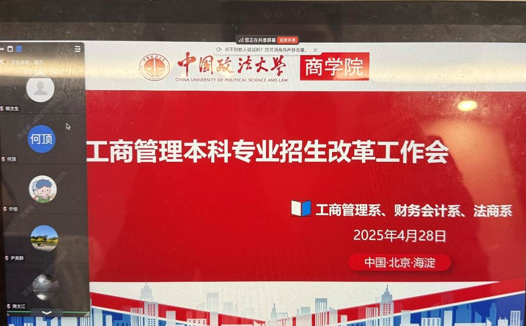 2025年4月28日,商学院召开工商管理本科专业招生改革工作会。商学院院长商文江教授,党委书记韩文生教授,副院长熊金武教授、尹美群教授、刘志雄教授,以及工商管理系、法商管理系、财务会计系全体教师通过线上线下相结合的方式参加会议。会议由院长助理郭颖教授主持。