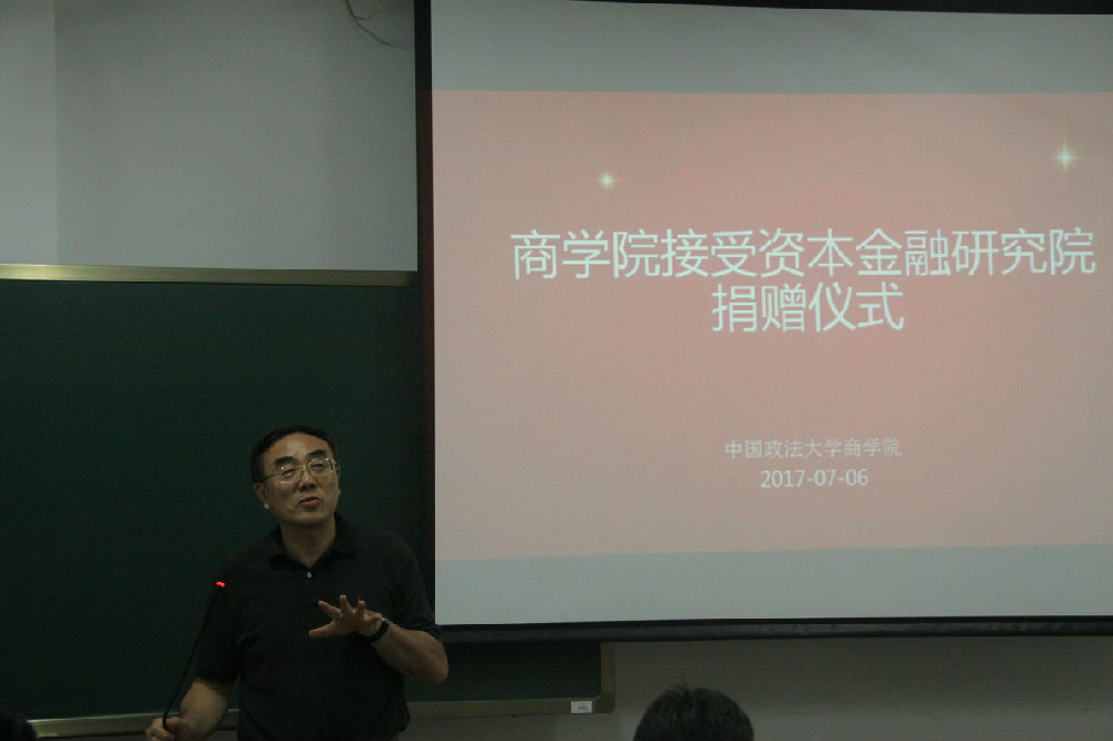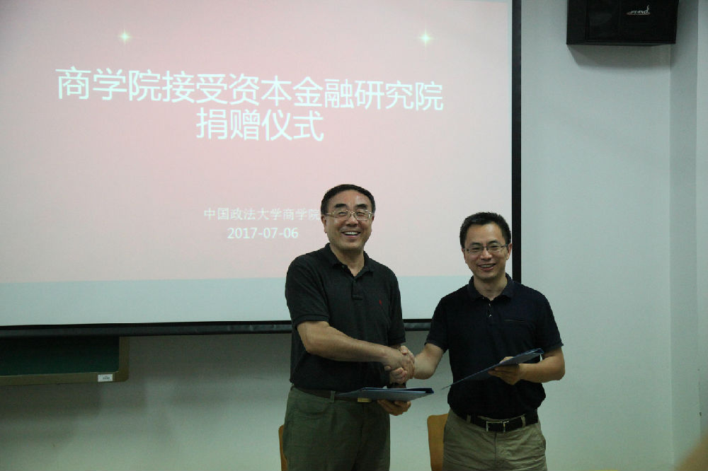 大会首先举行了商学院接受资本金融研究院捐赠仪式。在热烈的掌声中,刘纪鹏作为资本金融研究院院长与李欣宇共同签署捐赠协议,资本金融研究院向商学院捐赠10万元。刘院长在致辞中表示,此次捐赠的10万元将作为奖励基金,用于奖励多位教职工在学院工作中做出的突出贡献。