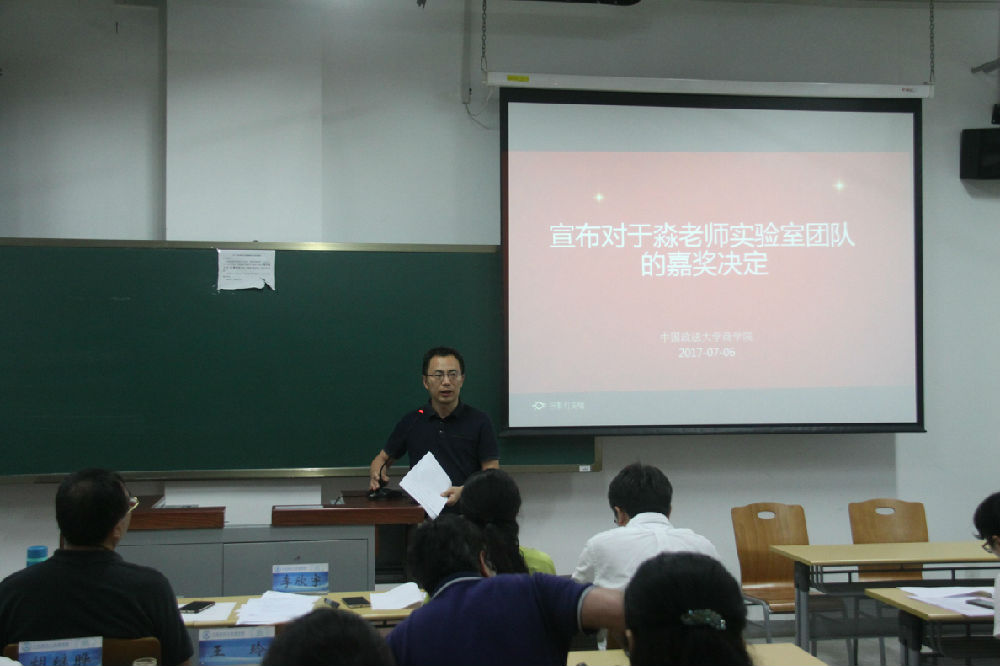 随后,李欣宇宣读了《关于嘉奖于淼教授实验室团队的决定》。2017年上半年,于淼教授及其团队申报的《必赢242net官网智慧实验室项目》获得教育部审批通过,并将获得专项维修基金420万元。商学院决定对于淼教授实验室团队进行嘉奖,奖金6万元。于淼教授在致辞中向院领导和学院的老师们表达了感谢,同时也向参会领导和老师介绍了商学院的实验室建设情况。