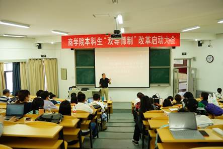 首先,刘纪鹏院长致辞,做关于启动商学院本科生双导师制改革的动员报告。刘院长先后谈到了正在改革中的档案制度建设、党团工作建设、师德师风建设、OA办公自动化系统、预算管理、流程管理、双导师制建设等,刘院长表示各方面工作都按照改革发展规划逐步走向正轨,而双导师制,在某种程度上是对班主任制度缺陷的填补,也是教学改革的收官之战。