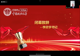 最后,商学院党委书记李欣宇教授为本次大会做闭幕致辞。李欣宇教授首先对上届MBA联合会作出的成绩表示认可,祝贺他们顺利圆满完成任务并光荣卸任,高度赞许今天参与竞选的演讲者们清晰美好的工作规划,并对汪鑫强同学当选本次MBA联合会主席表示祝贺。李书记表示,上一届MBA联合会在抗疫的特殊背景下、在受限制的条件下进行了具有创新性的工作,卓有成效,深受同学老师的热烈欢迎,令人印象深刻。李书记对新一任MBA联合会做出期许,提示世界上的事物都是美好的,一切前所未有的产品都是在有限的资源和受约束的情况下不断创新、创造出来的,每一件事都有它的限制和变数,MBA联合会工作要充分发挥自身创造性和主动性,服务同学、打响法大MBA品牌。最后,李书记预祝新一届MBA联合会工作顺利。