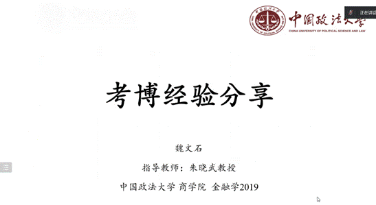 刘丁一同学分享了从决定考博到完成考博整个流程中所要注意的问题。在择校环节中,刘丁一同学建议广大同学们多和硕士生导师进行交流沟通,从而确定符合自身条件的院校和目标博士生导师。材料申请环节过程中,除了学术研究成果材料外,刘同学还特意强调了外语证书的重要性,意向攻读博士的同学要面对将来阅读大量国外期刊的科研路程,因此外语证书在材料申请环节中也占据了重要地位,并鼓励同学们尽早的将语言证书拿到。笔试环节中,鉴于部分同学会申报多所目标院校,因而刘同学建议同学们采取先难后易的方法进行备考复习,复习之中多做相关知识的整理,最好自身能够整理和归纳出专业知识的逻辑框架,从而更加从容的面对专业课的笔试。面试环节中,刘同学建议同学们尽可能地展示自己的研究兴趣以及和院校项目的匹配度,不要过度紧张。