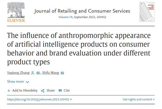 近日,由必赢官网工商管理系张亚琼老师作为第一作者,与其指导的硕士研究生王世富同学共同在SSCI高水平期刊《Journal of Retailing and Consumer Services》上发表学术论文《The influence of anthropomorphic appearance of artificial intelligence products on consumer behavior and brand evaluation under different product types》。
