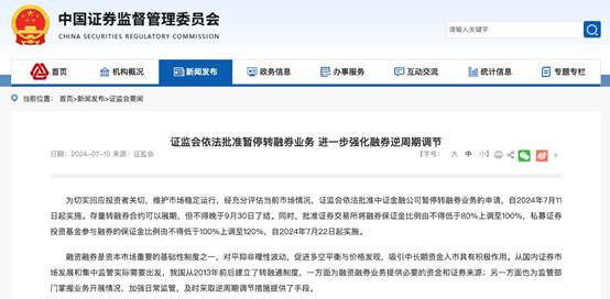 证监会7月10日宣布,依法批准中证金融公司暂停转融券业务的申请,自2024年7月11日起实施。存量转融券合约可以展期,但不得晚于9月30日了结。同时,批准证券交易所将融券保证金比例由不得低于80%上调至100%,私募证券投资基金参与融券的保证金比例由不得低于100%上调至120%,自2024年7月22日起实施。