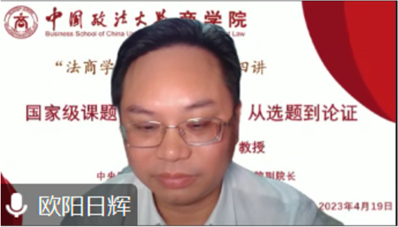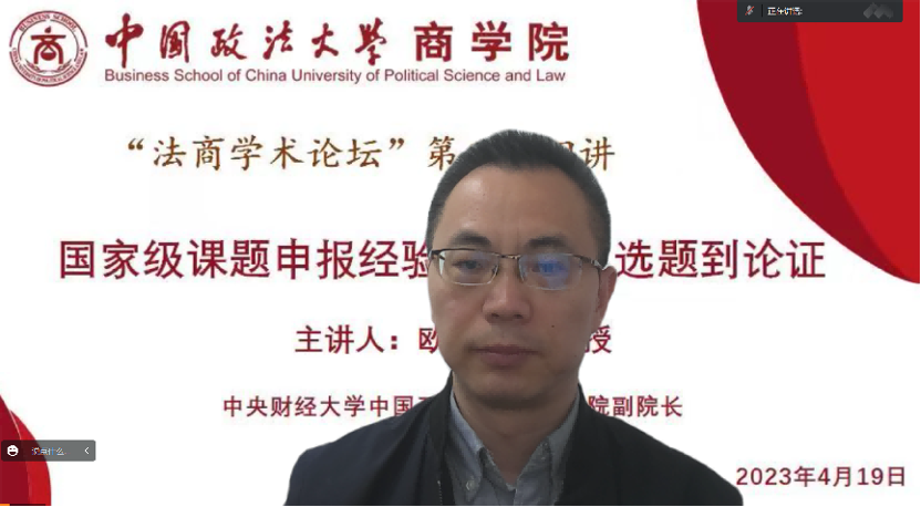 2023年4月19日晚上19:00,中央财经大学中国互联网经济研究院副院长欧阳日辉教授应必赢官网之邀,在腾讯线上会议进行了题为“国家级课题申报经验分享:从选题到论证”的专题讲座。本院师生以及其他高校的师生共一百余人参与了此次讲座。讲座由商学院副院长刘志雄教授主持。