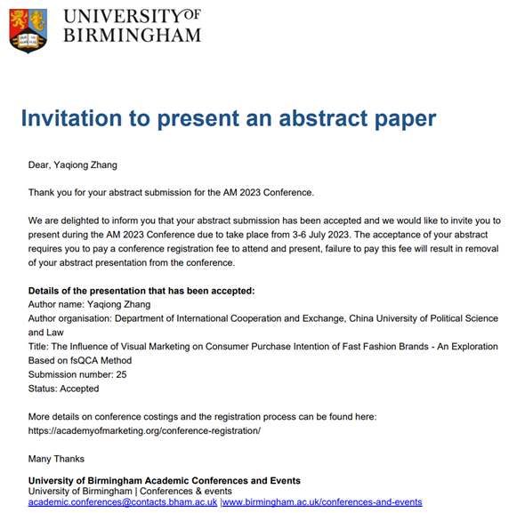 应Academy of Marketing Conference(欧洲营销学会)和英国伯明翰大学商学院的邀请,商学院讲师张亚琼于2023年7月2日至7月8日赴英国伯明翰地区出席Academy of Marketing Conference(欧洲营销学会)学术会议,并在会议上进行了主题演讲,论文题目为:The Influence of Visual Marketing on Consumer Purchase Intention of Fast Fashion Brands - An Exploration Based on fsQCA Method。