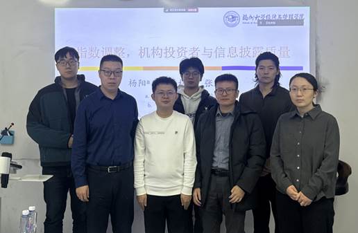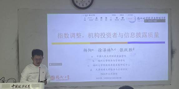 2024年11月29日下午,商学院资本金融系邀请经济学博士、福州大学经济与管理学院财政金融系徐泽林副教授在学院路校区教学图书综合楼0506会议室做了主题为《指数调整、机构投资者与上市公司信息披露质量》的学术讲座。本次讲座由商学院讲师孙玉哲老师主持,资本金融系副主任洪智武副教授、李伯尧副教授与谈。讲座吸引了多位商学院师生的参与。