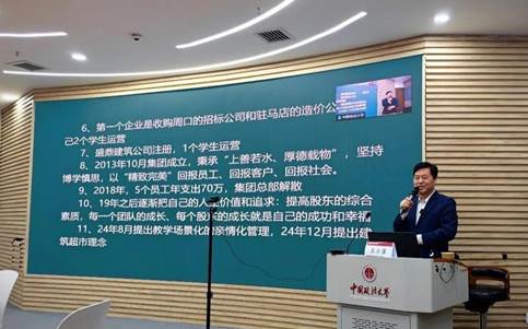 讲授环节中,王小召教授分享了其从讲师成长为企业的创办合伙人的历程与感悟,深入阐述了企业亲情化管理文化的形成及其在教学场景中的应用。他以明天建设集团为例,详细介绍了如何将亲情化元素融入管理实践,通过构建师生关系的企业文化,增强团队凝聚力与员工归属感,进而提升效率和创新能力。王小召教授强调,亲情化管理以信任、尊重和支持为基础,领导者应作为导师关注员工成长,而员工则需积极进取、持续学习。此外,王小召教授还特别介绍了建筑超市的创新理念,明天建筑超市作为集团旗下60多家建筑企业的集合体,为建设单位提供一站式服务,同时为自由职业者打造了共享办公和资源共享平台。