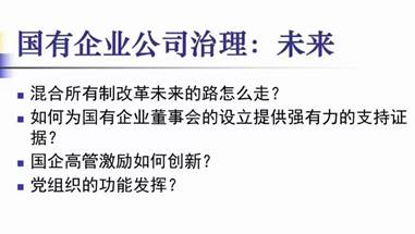 在讲座阶段,毛新述老师主要分三大部分进行报告:一是国有企业和公司治理框架,二是国有企业公司治理制度背景,三是国有企业公司治理研究探索。在制度背景部分,毛新述老师向大家分享了十八届三中全会以来国有企业公司治理方面的制度文件,使大家对国有企业公司治理的制度背景有了更深入的了解。并介绍了近年有关国有资产管理和国企改革方面的研究及项目,探讨了国有企业公司治理研究的挑战和创新。此外,毛新述老师分享了最近的研究:央企董事会建设与企业投资。最后毛新述老师对国有企业公司治理的未来进行展望,混合所有制改革未来的路怎么走,如何为国有企业董事会的设立提供强有力的支持证据,国企高管激励如何创新以及党组织的功能发挥。