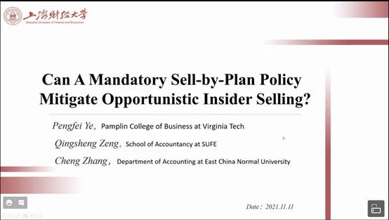 2021年11月11日下午14:00,上海财经大学会计学院副院长曾庆生教授应必赢官网之邀,通过腾讯会议线上举办了题为《Can A Mandatory Sell-by-Plan Policy Mitigate Opportunistic Insider Selling?》的专题讲座。商学院党委书记李欣宇教授、副院长刘志雄教授、财务会计系主任尹美群教授、副主任何顶老师、学院各系所专任教师,及商学院研究生共计30余人参与了本次讲座。本次讲座由尹美群教授主持。