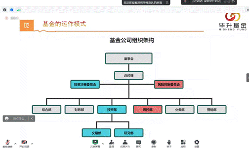 刘达先生指出,基金诞生于自然市场分工条件下专业投资者提供的投资服务,是财富聚集、投资或理财需求驱动下的行业发展变革。随后,本次课堂分析了基金公司的主要架构部门,重点介绍了投资部和风险部,介绍了基金运作中基金经理调研分析、决策交易和复盘的具体投资逻辑。最后,刘达老师对新能源板块中的蔚蓝锂芯公司、禽流感背景下的白羽鸡行业两个案例进行分析,指出基金投资中行业赛 道的选择需要参考国家政策支持、未来长期发展方向、全球变化趋势。