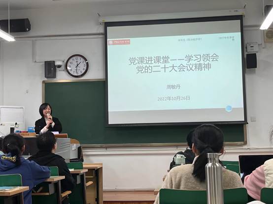 2022年10月26日,在必赢242net官网昌平校区,经济学党支部周敏丹老师把“党的二十大精神”融入商学院本科生专业必修课《政治经济学》的课堂,带领2022级国际商务专业的同学们共同学习领会“党的二十大精神”。