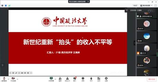 王禹婷同学以“新世纪重新‘抬头’的收入不平等”为题进行汇报。她认为《21世纪资本论》作为一本备受争议的书,在获得认可的同时也被西方左派从不同的视角进行批评。皮凯蒂在论述了前人有关收入不平等的研究及不足后,基于最近三个世纪的数据提出了特殊时期的特殊事件冲击带来的贫富分化缩小并不是资本主义发展的一般规律。此外,本书中所描述的现象正在被实践着,如美国“占领华尔街”运动、法国“黄马甲”抗议等,皮凯蒂的成功与当下西方社会主义思潮的复兴密不可分。报告最后讨论了皮凯蒂的观点在中国是否适用的问题,指出中国的贫富差距可能主要来自于机会不平等,相关问题需要放在特定的背景下进行讨论。