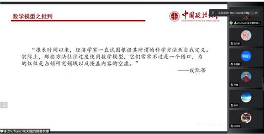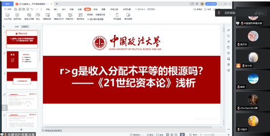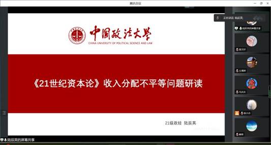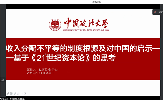 2023年1月4日上午,商学院经济系、经济学党支部在线上腾讯会议平台成功举办了2022年第8期(总第43期)研究生读书会,阅读书籍为法国经济学家托马斯·皮凯蒂所著《21世纪资本论》。本次读书会由经济系邓达老师、黄立君老师、周敏丹老师和司海平老师共同指导,创新经济学特聘博导方竹兰老师、工商管理系马克态老师出席,熊柴老师推荐书目并主持,2021级和2022级政治经济学、西方经济学专业同学参加。2021级陆辰英、王禹婷同学和2022级朱天赐、申晨笛、赵于钧同学作主报告。