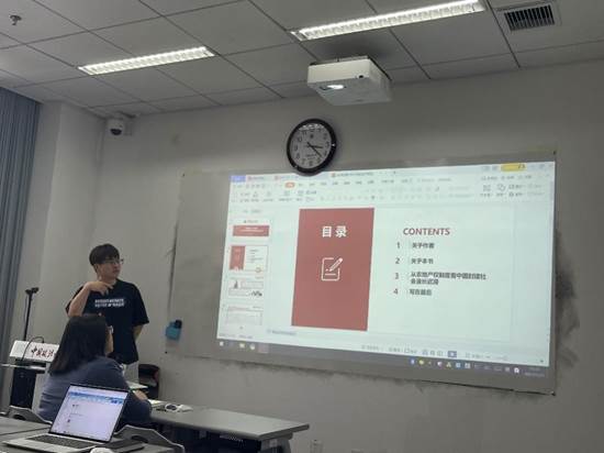 贾文轩同学从农地产权制度的角度分析中国封建社会漫长迟滞,并以此为题进行了主报告。贾文轩同学在介绍本书主要内容后,分析了中国封建社会漫长迟滞的原因,认为土地产权制度的不稳定性、产权变动的社会运行成本等阻碍了经济的发展,而土地产权的清晰是促使经济增长的重要激励,最后从生产资料和劳动力的产权结合层面分析了中国封建社会的土地所有制封建庄园经济更迭的原因。陈明生老师提出应明确“封建庄园”的概念,以便进一步研究封建土地制度。