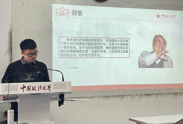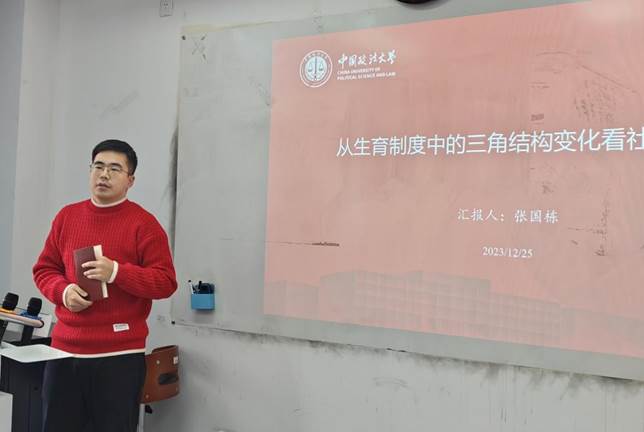 张国栋同学以“从生育制度中的三角结构变化看社会变迁”为题,从中国传统生育制度的功能出发,基于生物学角度和社会学角度介绍生育制度的定义和功能,并详细阐述由此产生的社会结构中的基本三角——婚姻、家庭与亲子关系,将婚姻概括为满足抚育子女、经济和两性关系三种功能的混合制度。此外,张国栋同学还对社会结构基本三角存在的内生性矛盾与带来的社会变迁进行分析和探讨。最后,他联系当今社会的具体情况提出,书中所持的社会本位观和功能论观点存在一定的待完善之处,需要根据变化的社会现实对生育制度进行进一步的研究。