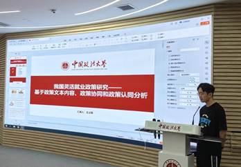 随后,王占营同学进行了毕业论文研究进展情况的汇报,其研究主题为我国灵活就业政策研究。他首先阐述了该论文的研究背景与意义、研究思路与内容,并从多个角度回顾了相关文献研究和理论阐释;他根据研究内容从政策文本分析、政策协同分析和政策认同分析分别展开了研究过程和数据基本结果,并提出后续的研究计划。汇报结束后,师生热烈讨论,从研究内容的连贯性着手,提出了诸多有针对性的建议和意见。