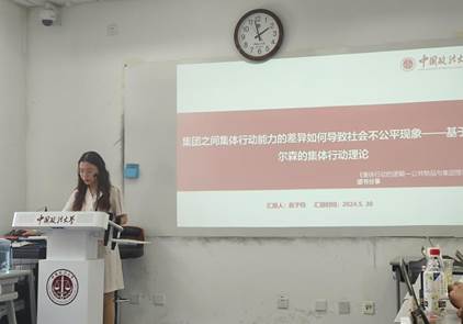 赵于钧同学以“集团之间集体行动能力的差异导致的社会不公平现象——基于奥尔森的集体行动理论”为题,构建集体行动的逻辑思维导图来阐释奥尔森集体行动理论的辩证过程,指出奥尔森以理性人假设、个人主义方法论以及公共物品理论为基础,批判传统集团理论并构建了自己的集体行动理论。进一步分析了影响集团集体行动的两个关键变量:集团规模和集团非对称性,并探讨了利益集团集体行动能力差异与社会不公平的产生。最后和大家探讨了奥尔森对利益集团功能的认识是否有失偏颇。