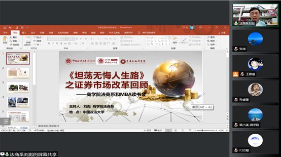6月23日,由商学院法商系与法大MBA联合会联合举办的研究生读书会顺利召开,本期读书会的主题为“证券市场改革回顾”,推荐阅读书目为曹凤岐教授的著作《坦荡人生无悔路》。本期读书会旨在通过跨专业、跨学科的交流,从不同角度理解和认识中国证券市场的发展历程与证券监管改革举措。商学院刘志雄副院长,商学院法商系部分教师和MBA师生30余人通过腾讯会议的方式参加了此次活动。