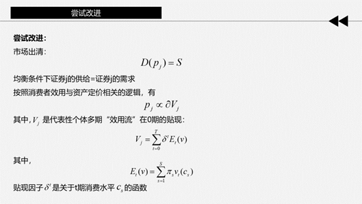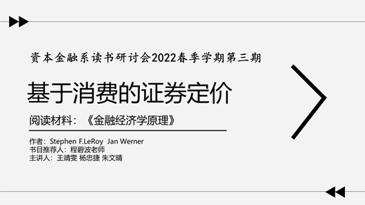 最后,王靖雯同学介绍了如何跟据基于消费的证券定价公式推导出传统的CAPM模型,解释了推导过程中蕴涵着的经济学意义。并对基于消费的证券定价模型做出评注,指出其适用性与局限性,并根据自身的理论积累水平尝试对此做出了改进。