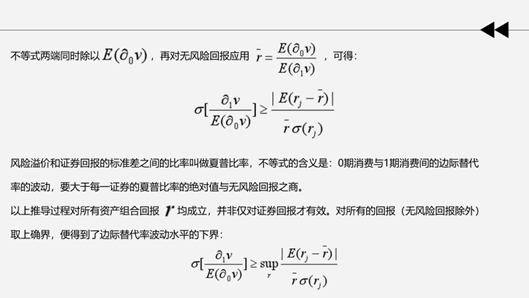 的推导和计算过程。并由此得出“某一证券的风险溢价仅仅依赖于其回报同0期1期消费边际替代率之间的协方差”的结论。在此基础上,延展出对边际替代率波动性的讨论,得出“0期消费与1期消费间的边际替代率的波动,要大于每一证券的夏普比率的绝对值与无风险回报之商”的结论。