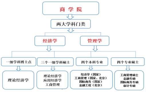 商学院设置经济系、工商管理系、产业经济系、法商系、资本金融系、财务会计系、国际商务系和企业史研究所(“七系一所”)8个教学机构;现有专任教师近80人,其中教授25人,副教授22人,博士生导师16人,均来源于国内外一流高校,学术视野宽阔,研究能力突出,学术积淀厚实,研究成果丰硕。